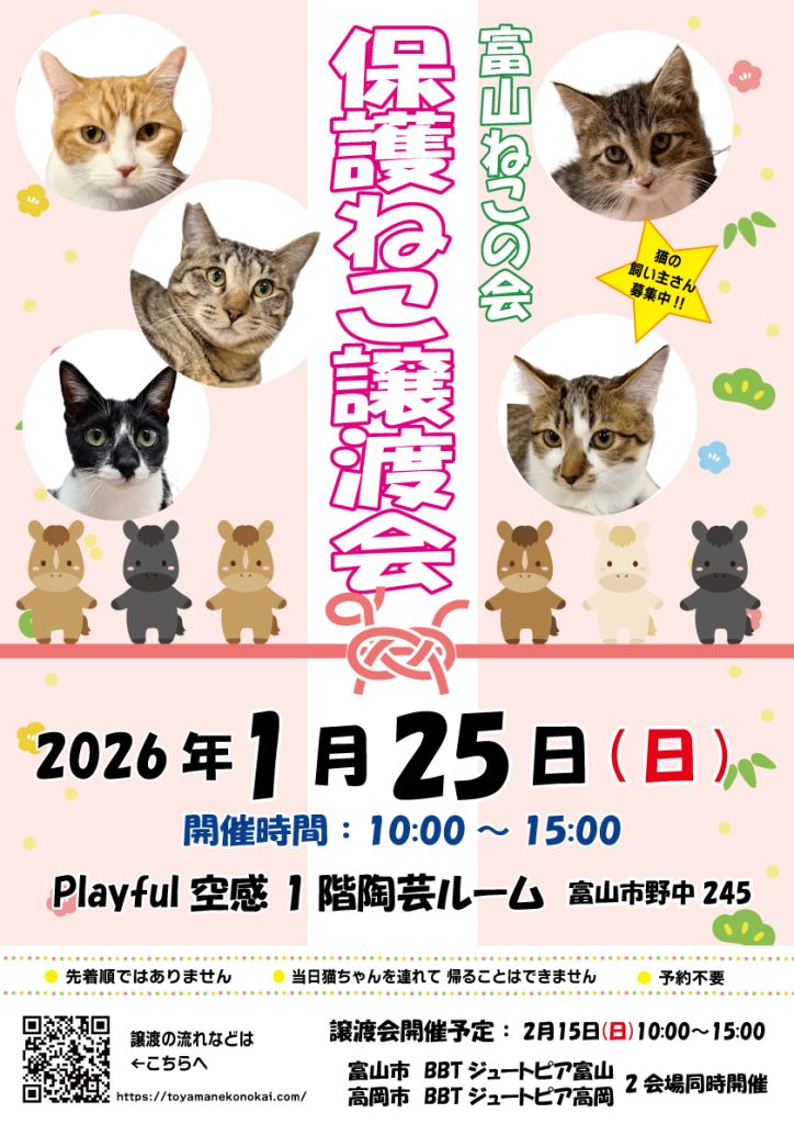 「富山ねこの会」は月に2回程度のペースで「保護ねこ譲渡会」を開催しています。